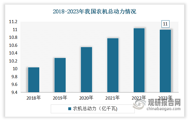 机械总动力持续增加。近年我国农业机械总动力持续增加,到目前曾经成为农业出产中不成或缺的一部门。对于提超出跨越产效率和降低劳动强度有着主要感化。数据显示,2023年我国农机总动力达到11亿千瓦。